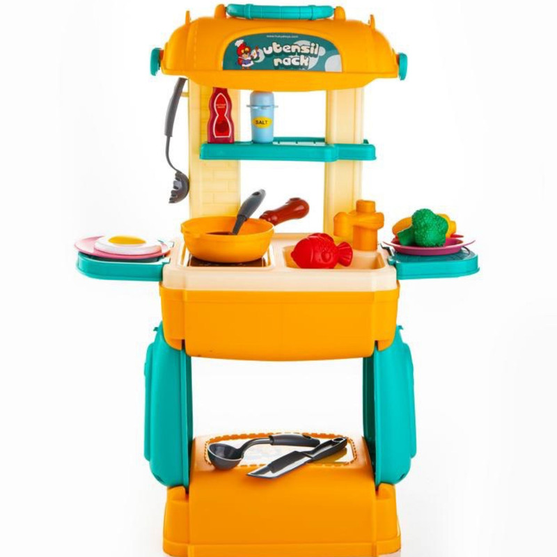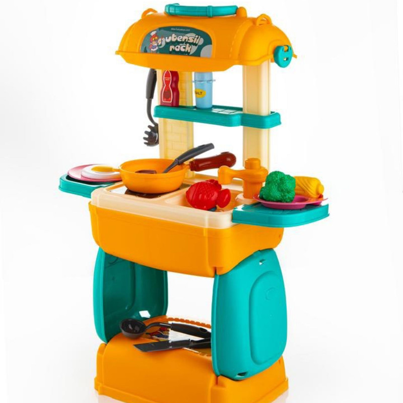 شامل اجاق گاز، تابه، قابلمه، بشقاب، قاشق، چنگال و انواع ابزار آشپزی دارای مواد غذایی پلاستیکی شامل سبزیجات، بطری نمک و سس