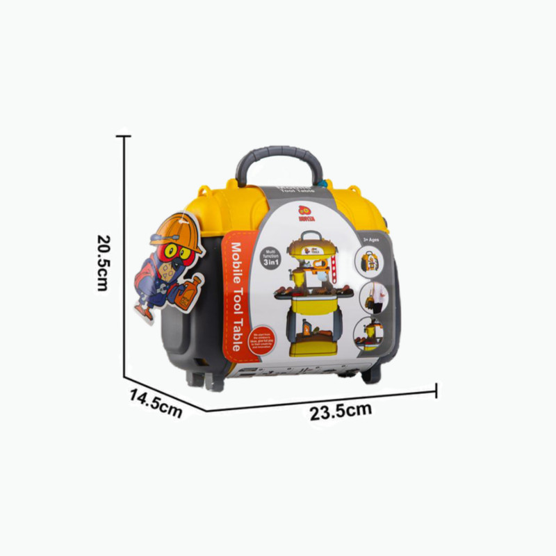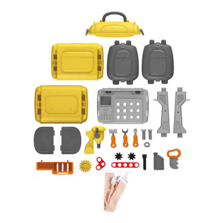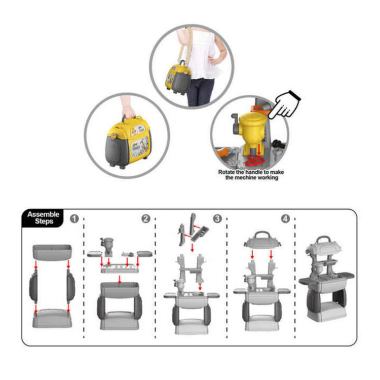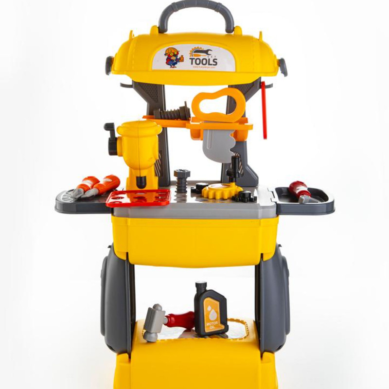 دریل اسباببازی اره دستی پیچگوشتی آچار فرانسه انبردست چکش بطری روغن موتور پیچ و مهرهها چرخدندهها میز کار قابل مونتاژ پایهها و قطعات اتصال برچسب کیف قابل حمل (که خود میز از درون آن ساخته میشود)